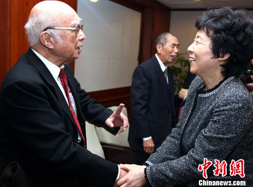嚴(yán)雋琪13日在臺(tái)北圓山大飯店會(huì)見8位在臺(tái)原福建省立農(nóng)學(xué)院首屆校友。中新社記者 關(guān)向東 攝