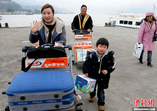 1月19日春運首日,乘坐“兩馬” ( 馬尾——馬祖)航線“閩珠一號”客輪返鄉過年的臺胞抵達福州港馬尾客運碼頭。預計春運期間“兩馬”航線運送旅客人數約5000人次。2011年是“兩馬”航線運行的第十一個年頭,十年間,福州邊檢站共檢查兩岸直航船舶7386艘次,旅客395564人次。中新社記者 劉可耕 攝