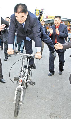 大陸首善陳光標29日到南投紫南宮參拜時看到路旁有腳踏車,一時興起,表演單腳騎車特技。