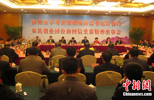 31日,福建漳州各界舉行座談會熱議胡錦濤給福建漳浦和漳平永福臺灣農(nóng)民創(chuàng)業(yè)園臺商農(nóng)民的回信。與會當(dāng)?shù)刂_商表示,將繼續(xù)深耕大陸,相信企業(yè)在大陸發(fā)展蒸蒸日上。
