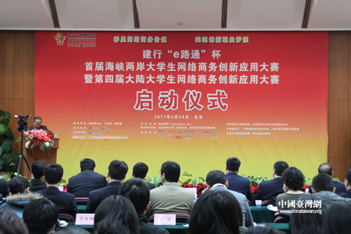 中國臺灣網3月24日北京消息 由中國互聯網協會和中國臺灣網共同主辦的“建行e路通杯首屆海峽兩岸大學生網絡商務創新應用大賽暨第四屆大陸大學生網絡商務創新應用大賽”今日上午在北京舉行啟動儀式。主辦方表示,期望能借此加強兩岸互聯網業界、以及高校學生的交流借鑒,促進共同發展。
