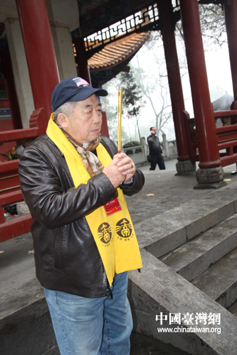 來自臺北,原籍長沙的魯燦云老先生,今年已經81歲,在清明祭祀的儀式上幾乎總是落在隊尾,卻堅持從陵園入口一路跋涉至炎帝陵前,盡心竭力虔誠祭拜始祖炎帝神農氏。(中國臺灣網 楊麗 攝)