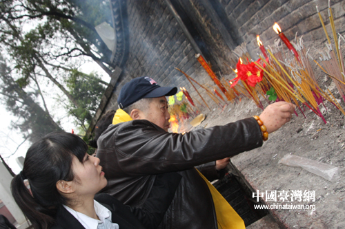 在工作人員的協助下,81歲的魯燦云老先生從陵園入口一路跋涉至炎帝陵前,虔誠為始祖敬香。(中國臺灣網 楊麗 攝)