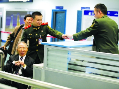 歐陽老人(左)下飛機后,邊檢人員迅速為其辦理通關手續。