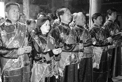 9日,李沃士(左三)和夫人蘇鳳英(左二)在湄洲媽祖祖廟向媽祖金身進香