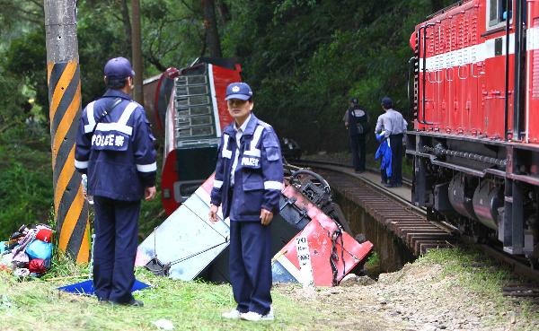 4月27日,警察在臺(tái)灣阿里山火車事故現(xiàn)場(chǎng)警戒。記者從臺(tái)灣觀光主管部門獲悉,截至27日15時(shí)30分,在阿里山小火車翻車事故中,共有5個(gè)大陸旅行團(tuán)涉及,已確認(rèn)23人受傷、5人死亡、1人失蹤,確認(rèn)死亡的5人均為大陸游客。嘉義縣政府消防局表示,這起意外發(fā)生在中午12時(shí)17分左右,一列掛有8節(jié)車廂的小火車從神木站開往阿里山站,行經(jīng)70公里250米處,突然有棵大楠木枝干斷裂,剛好擊中最后一節(jié)車廂,結(jié)果造成多節(jié)車廂翻覆,釀成意外。新華社記者龔兵攝
