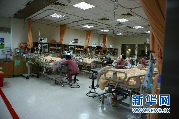 新華社照片,嘉義(臺灣),2011年4月28日 阿里山火車事故傷者繼續接受治療 4月28日,工作人員在臺灣嘉義市圣馬爾定醫院的加護病房內忙碌。當日,在阿里山火車事故中受傷的大多數乘客已出院,目前留在圣馬爾定醫院接受治療的還有16人,其中兩名重傷員仍在加護病房中接受治療。臺灣阿里山27日中午發生小火車翻車事故,截至當天晚間11時,事故已造成5名大陸游客罹難,百余名大陸游客不同程度受傷。 新華社記者龔兵攝