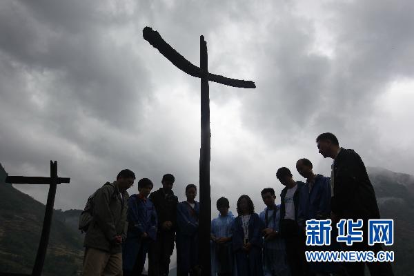 資料圖片:5月9日,在“5.12”汶川地震重災(zāi)區(qū)四川省青川縣東河口地震遺址公園,在青川參加災(zāi)民安置房援建工作的香港迪士尼樂園的志愿者在雨中默哀。 新華社記者 任正來 攝