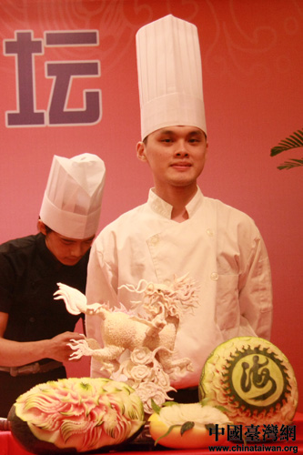 此次廚藝交流活動,設蔬果雕刻、拉面和調酒三個交流項目。其中果蔬雕刻表演分兩階段組成,第一階段是在最短的時間內完成果雕,第二階段雕刻出最拿手的果雕產品,兩岸果雕選手同場競技,他們栩栩如生又賦予寓意的果雕作品,引臺下贊嘆聲不斷。