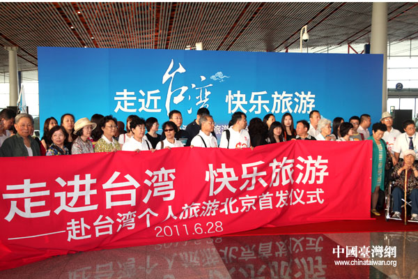赴臺個人游啟動首日,第一批61名游客將于今日上午8:30乘坐國航ca185航班自北京起飛,預(yù)計中午(28日)之前抵達臺北桃園機場。國家旅游局、國臺辦、北京市旅游局、臺旅會等部門在首都機場為首日首批赴臺游客舉行了簡短的歡送儀式。