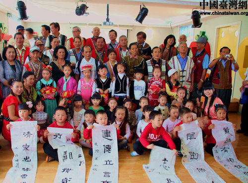 表演結束后,臺灣少數(shù)民族長老頭目們向小朋友們贈送小禮物,一起合影留念。(中國臺灣網(wǎng) 芮益芳 攝)