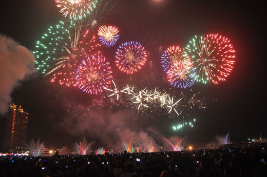 2012高雄燈會藝術節29日在高雄光榮碼頭開幕,結合煙火及水舞秀,火樹銀花,燦爛奪目。