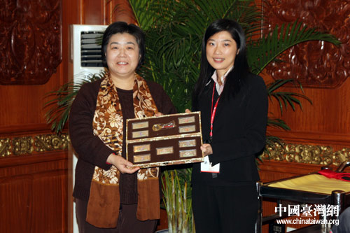 中國(guó)宋慶齡基金會(huì)聯(lián)絡(luò)部副部長(zhǎng)宋建(左)和臺(tái)灣十杰基金會(huì)人員互贈(zèng)禮物(中國(guó)臺(tái)灣網(wǎng) 郜利敏 攝)