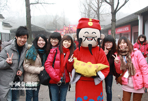 臺灣學生和大陸高校志愿者在虎丘門前合影。(中國臺灣網 栗琰 攝)
