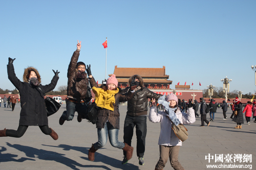 讓我們一起跳起來!來自臺灣的青年學生在天安門廣場跳著合影 (中國臺灣網 王新妍 攝)