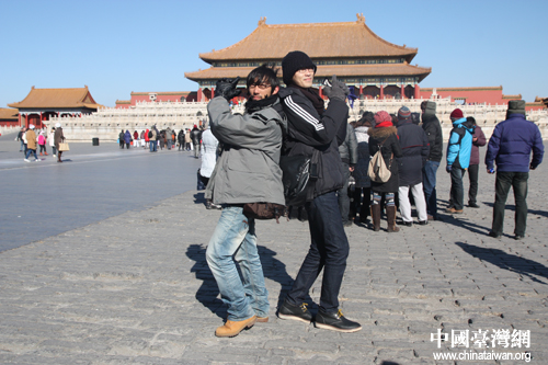 故宮前擺個酷照吧!來自臺灣的青年學子在故宮拍照留念 (中國臺灣網 王新妍 攝)