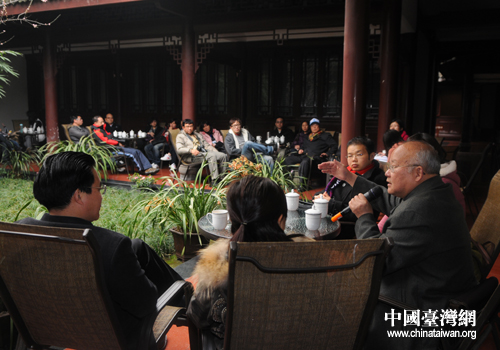在杜甫草堂一座幽靜的別院,四川省臺辦邀請了四川知名學者袁庭棟教授為參訪團一行作了一堂精彩的巴蜀文化講座。袁庭棟從天府四川地理環境、物產資源、歷史變遷、文化名人、生活習性、客家族群、方言文化、產業發展等方面向來川參訪的臺灣中華聯合青年議事協會參訪團一行介紹了悠久濃厚的巴蜀文化、蓬勃發展的現代四川。
