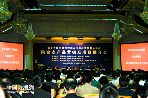 中國臺灣網4月6日西安消息 4月5日,第十六屆西洽會“陜臺農產品營銷及項目推介會”在陜西舉行。來自臺灣涉農企業界人士及陜西省有關市縣招商部門近300人參加了會議,陜西省人大常委會副主任張邁曾,陜西省臺辦副主任王康、何銳及相關單位領導出席活動。