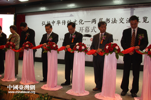 “弘揚中華傳統(tǒng)文化--兩岸書法交流展覽”于6月1日在北京臺灣會館開幕,出席嘉賓在開幕式上剪裁。(中國臺灣網(wǎng) 陳寧 攝)