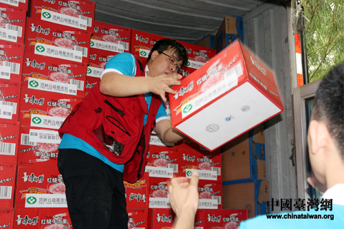頂新集團工作人員和房山區(qū)的志愿者一起搬運方便面。(中國臺灣網(wǎng)記者 郜利敏 攝)