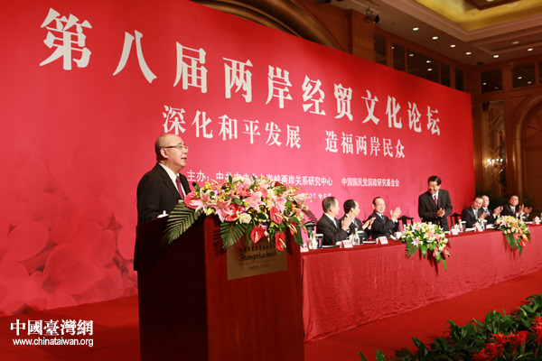 [中國臺灣網]:第八屆兩岸經貿文化論壇由中共中央臺灣工作辦公室海峽兩岸關系研究中心與中國國民黨國政研究基金會共同主辦。與會人士圍繞“深化和平發展、造福兩岸民眾”這一主題,就和平發展回顧與前瞻、深化經貿合作、擴大文教交流等三項議題進行研討。[15:04]