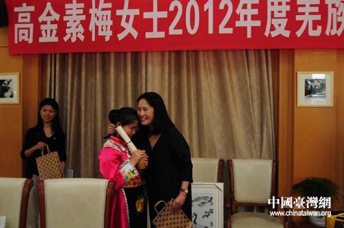 四川省臺(tái)辦副主任張軍在發(fā)放儀式上說,高金素梅女士5年來持續(xù)率臺(tái)灣少數(shù)民族參訪團(tuán)來川參訪交流,為災(zāi)區(qū)民眾祈福,助養(yǎng)北川羌族受災(zāi)學(xué)生,令我們感動(dòng)不已。感謝高金素梅女士在推動(dòng)四川與臺(tái)灣交流特別是兩地少數(shù)民族交流、青少年交流,以及傳承和彰顯兩岸同胞友愛互助等方面所付出的心血和貢獻(xiàn)。前不久,成都大熊貓繁育研究基地在西部首個(gè)入選海峽兩岸交流基地,成為了四川與臺(tái)灣交流合作的新平臺(tái),歡迎更多的臺(tái)灣同胞到四川、到成都、到大熊貓基地交流參訪,共同推動(dòng)四川與臺(tái)灣的交流持續(xù)深入開展。