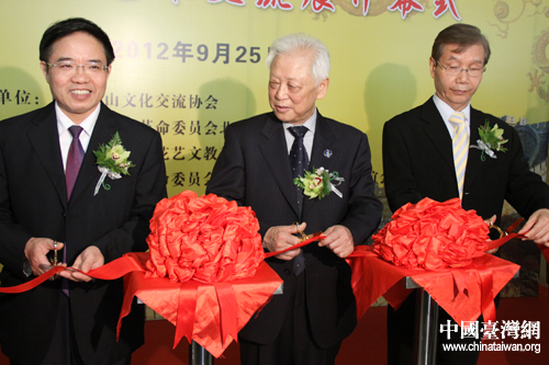 全國人大常委會副委員長、民革中央主席周鐵農(中),民革中央副主席傅惠民(左)、臺灣中華花藝文教基金會董事長黃永川(右)為開幕式剪彩。(中國臺灣網 吳怡 攝)