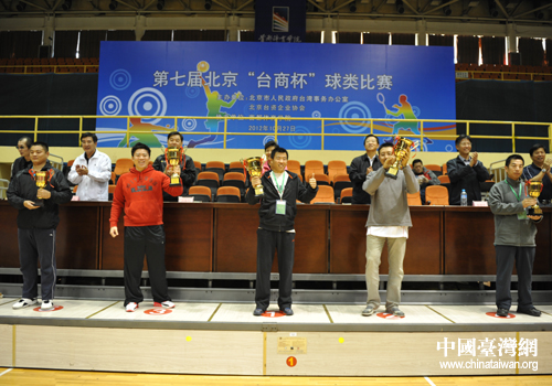 中國臺灣網10月29日北京消息 10月27日,第七屆“臺商杯”球類比賽在首都體育學院的北京大學生體育館舉行,來自北京市及各區縣臺辦、在京臺資企業以及高校的38支代表隊共300余名業余運動愛好者參賽。北京市臺辦主任馬玉萍,副主任王蘭棟、高振生,副巡視員杜德平、馬振生,北京臺協理事長林清發等出席開幕式和閉幕式。
