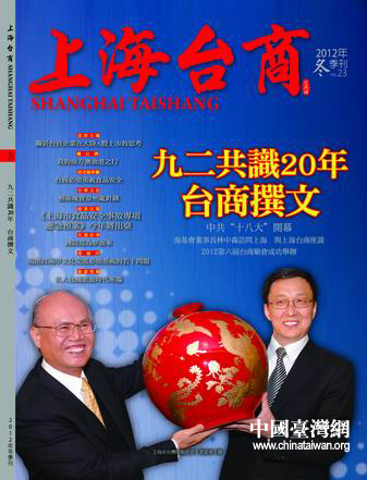 中國臺灣網11月14日上海消息  “九二共識”達成二十周年之際,上海臺商紛紛在新出版的2012年冬季刊《上海臺商》雜志上撰文,表示“九二共識”是兩岸經濟共創雙贏的重要保障,應珍惜“九二共識”的成果,繼續深化和發展“九二共識”精神。