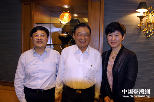 煙臺市經(jīng)貿(mào)考察團拜訪臺灣三三企業(yè)交流會,圖為煙臺市市長王良、副市長楊麗與臺灣“三三會”會長江丙坤合影。(圖片來源:煙臺市臺辦)