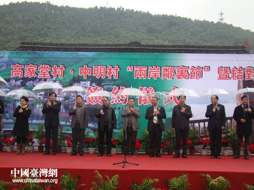 在高家堂村·中明村“兩岸鄰里節(jié)”暨結(jié)對簽約儀式上,湖州安吉縣山川鄉(xiāng)高家堂村村委會主任潘小眾說,因?yàn)榕_灣中明村是鄉(xiāng)村旅游,現(xiàn)代農(nóng)業(yè)比較不錯的地方,我們想跟他們學(xué)習(xí)一下,借鑒一下,今后多交往多交流。臺灣南投縣魚池鄉(xiāng)中明村村長楊昆欣表示,以后要進(jìn)一步來互相互動,發(fā)展觀光和產(chǎn)業(yè)。儀式上,兩村簽訂了“締結(jié)友好村協(xié)議”和“婦女組織友好結(jié)對協(xié)議”。隨后舉行了座談會,兩村就相互情況進(jìn)行了交流。兩村村長也親手合力種下了“友好樹”。
