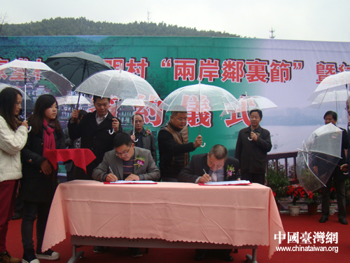 兩村村長簽訂兩村締結(jié)友好村協(xié)議。(圖片來源:湖州市臺辦)