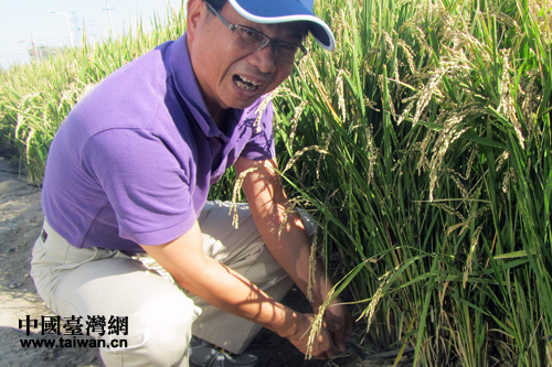 臺中市議員陳清龍向技術人員詢問旱稻種植的滴灌技術。(中國臺灣網 王偉 攝)