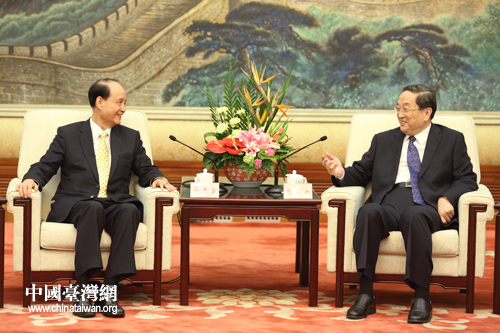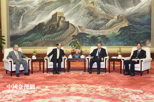 9月12日,全國政協主席俞正聲在北京人民大會堂會見臺灣海基會董事長林中森帶領的海基會董監事參訪團一行。(中國臺灣網 陳佳慧 攝)