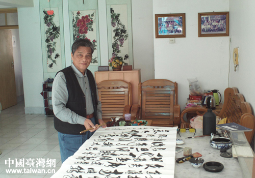 臺胞羅承鵬在家揮毫。(圖片來源:廣西臺辦)