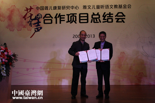中國聾兒康復(fù)研究中心主任胡向陽和明門集團(tuán)董事長、雅文兒童聽語文教基金會主席鄭欽明交換了下一個五年《中文聽覺口語師資培訓(xùn)項(xiàng)目合作協(xié)議》。(中國臺灣網(wǎng) 王怡然 攝)