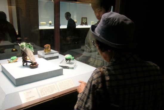 資料圖:兩位游客正在臺北故宮博物院觀賞國寶“翠玉白菜”。