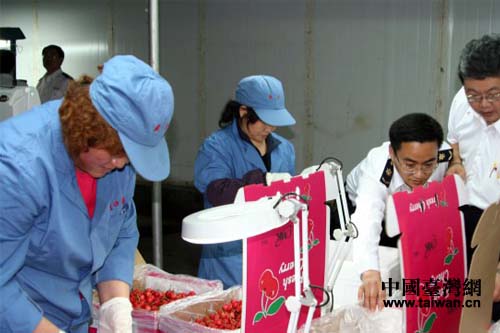 檢驗檢疫工作人員對煙臺大櫻桃進行檢驗。