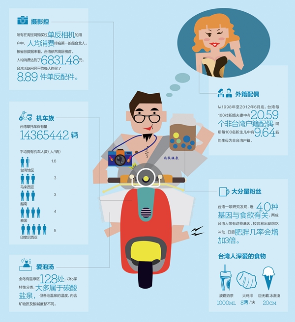 臺(tái)灣人為什么成為臺(tái)灣人,大概和下述幾點(diǎn)有關(guān)。開(kāi)著“小綿羊”與同伴談?wù)撜螉蕵?lè)八卦,買(mǎi)杯波霸奶茶,或點(diǎn)一大份雞排,深?lèi)?ài)泡湯和攝影。機(jī)車(chē)、美食、泡湯,成為臺(tái)灣人生活方式的重要組成部分。(圖片來(lái)源:外灘畫(huà)報(bào))