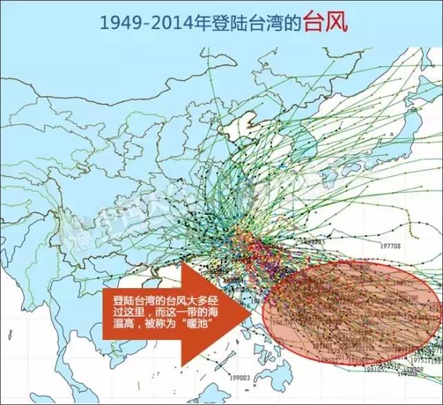 來看這張臺灣“臺風全家福”,它們大多經過菲律賓以東的太平洋。這里的海洋十分溫暖,最適合臺風生長,氣象上稱之為“暖池”。臺風就像是自然界的蒸汽機,能量主要來自水蒸氣凝結釋放出來的熱量,溫暖的海洋能為臺風提供燃料。而且廣袤的海洋相比陸地,對臺風的摩擦損耗很小。所以,菲律賓以東的太平洋是超強臺風的樂土。這密密麻麻的線頭中最密集的那一塊,就是已經被擋得看不清了的臺灣。