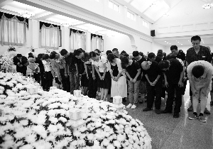 公祭儀式的尾聲,遇難者家屬在司儀的引導下,集體站到23名遇難市民的遺像前三鞠躬,然后手捧遺像接親人回家。
