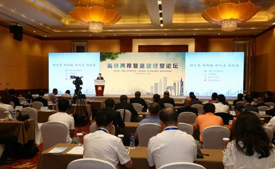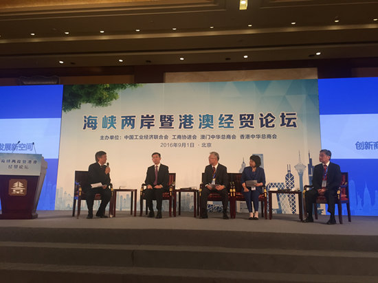 人民網北京9月1日電 1日上午,中國工業經濟聯合會、工商協進會、澳門中華總商會和香港中華總商會在北京舉行第五屆“海峽兩岸暨港澳經貿論壇”。論壇旨在促進海峽兩岸暨港澳地區間的經貿合作與交流,以“新常態、新思路、新機遇、新發展”為主題,著重探討兩岸四地在新形勢下,如何有效整合配置資源,促進經濟轉型,加強協同創新,克服挑戰,迎接發展新契機。