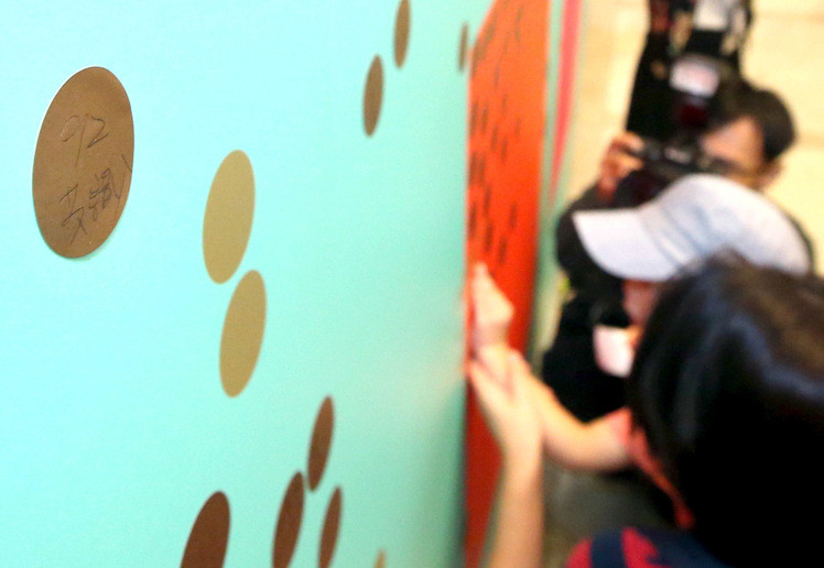 蔡英文辦公室開放參觀首日,陸客在貼板上寫“九二共識”表祝福。(圖片來源:臺灣《聯合報》)