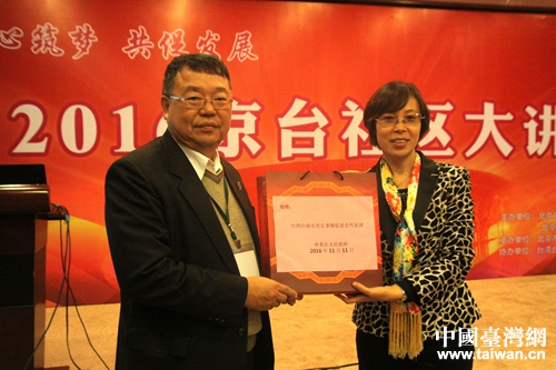 11日下午,在懷柔區雙陽賓館會議中心舉辦了“京臺社區大講堂”主題活動,北京市臺辦綜合處鄧勁松、懷柔區臺辦主任房淑軍、懷柔區委社會工委副書記郭寶新及臺南市的里長們出席活動。與會人員就社區志愿服務、社區低碳節能、社區關懷經驗等等主題作了發言交流。“兩岸一家親”這幾個字,在交流中多次提及,在場社區工作者認為兩岸本就是一家人,希望借助此次活動和京臺基層社區大講堂平臺,繼續深化合作,加強交流,借鑒彼此先進經驗。隨后雙方交換禮品,并合影留念。