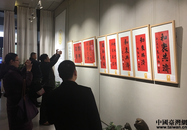 嘉賓為連戰、吳伯雄、朱立倫等人所贈書法作品拍照留念。(中國臺灣網 齊昕 攝)