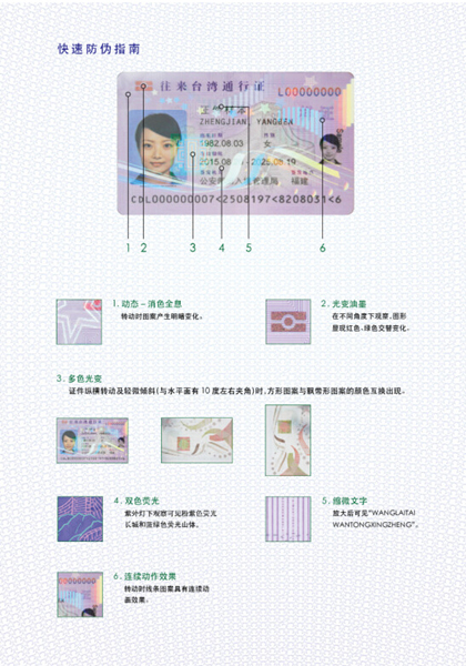 一、新版通行證為參照國(guó)際民航組織(ICAO)DOC9303 TD-1標(biāo)準(zhǔn)設(shè)計(jì)制作的卡式證件,內(nèi)嵌非接觸式集成電路芯片,采用多項(xiàng)物理防偽和數(shù)字安全技術(shù)。正面打印持證人個(gè)人資料以及證件簽發(fā)管理信息,背面打印前往臺(tái)灣簽注等信息并可由證件簽發(fā)機(jī)關(guān)重復(fù)擦寫(xiě)。新版通行證不再附發(fā)貼紙式簽注。