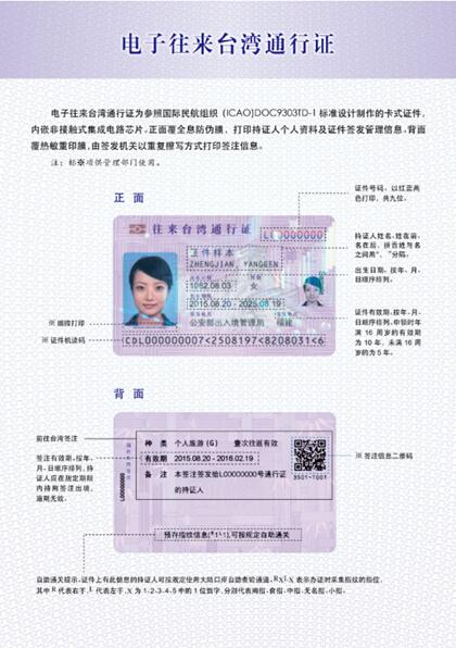 據(jù)了解,電子往來(lái)臺(tái)灣通行證為參照有關(guān)國(guó)際標(biāo)準(zhǔn)設(shè)計(jì)制作的卡式證件,內(nèi)嵌非接觸式集成電路芯片。前往臺(tái)灣簽注不再采取貼紙的方式,而是直接打印在證件背面,并可重復(fù)擦寫(xiě)。成人電子往來(lái)臺(tái)灣通行證有效期延長(zhǎng)為10年,對(duì)未滿(mǎn)16周歲的仍簽發(fā)5年有效通行證。根據(jù)《中華人民共和國(guó)出境入境管理法》有關(guān)規(guī)定,經(jīng)國(guó)務(wù)院批準(zhǔn),申領(lǐng)電子往來(lái)臺(tái)灣通行證應(yīng)當(dāng)按規(guī)定留存持證人指紋信息。已留存指紋信息的持證人出入境時(shí),可以按規(guī)定自助通關(guān)。