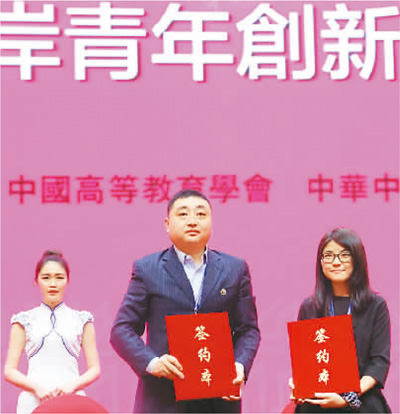 臺(tái)灣藝術(shù)大學(xué)學(xué)生施乃文(右)與大陸企業(yè)簽約,她的作品將進(jìn)入大陸市場(chǎng)。
