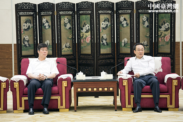 四川省常務(wù)副省長(zhǎng)王寧(右)會(huì)見(jiàn)“海峽兩岸記者四川行”聯(lián)合采訪團(tuán)一行,國(guó)務(wù)院臺(tái)辦主任助理周寧(左)參加會(huì)見(jiàn)。(中國(guó)臺(tái)灣網(wǎng) 于斯文 攝)
