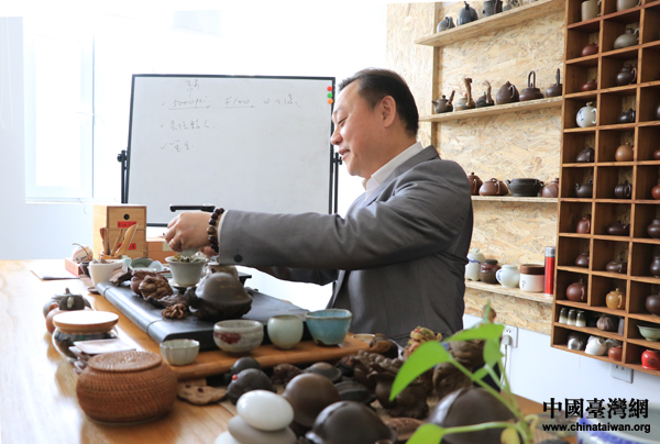 中國臺(tái)灣網(wǎng)11月14日天津訊 (記者 王思羽)“如果你去拜訪陳炳宏,那就一定能喝到他親手泡的茶”,對于熟悉天津臺(tái)資企業(yè)協(xié)會(huì)理事、兩岸青年中心董事長陳炳宏的朋友們而言,他的個(gè)人喜好與待客之道可謂無人不曉。走進(jìn)陳炳宏的會(huì)客室兼茶室,茶桌、茶具、茶寵一應(yīng)俱全,主人身后墻架上陳列的各式精巧茶壺,宛如一場正在舉辦的小型特展。據(jù)陳炳宏介紹,在自己的老家臺(tái)南,幾乎家家有茶桌,每天必泡茶。為來客、朋友奉茶既是傳統(tǒng),也是禮數(shù)。